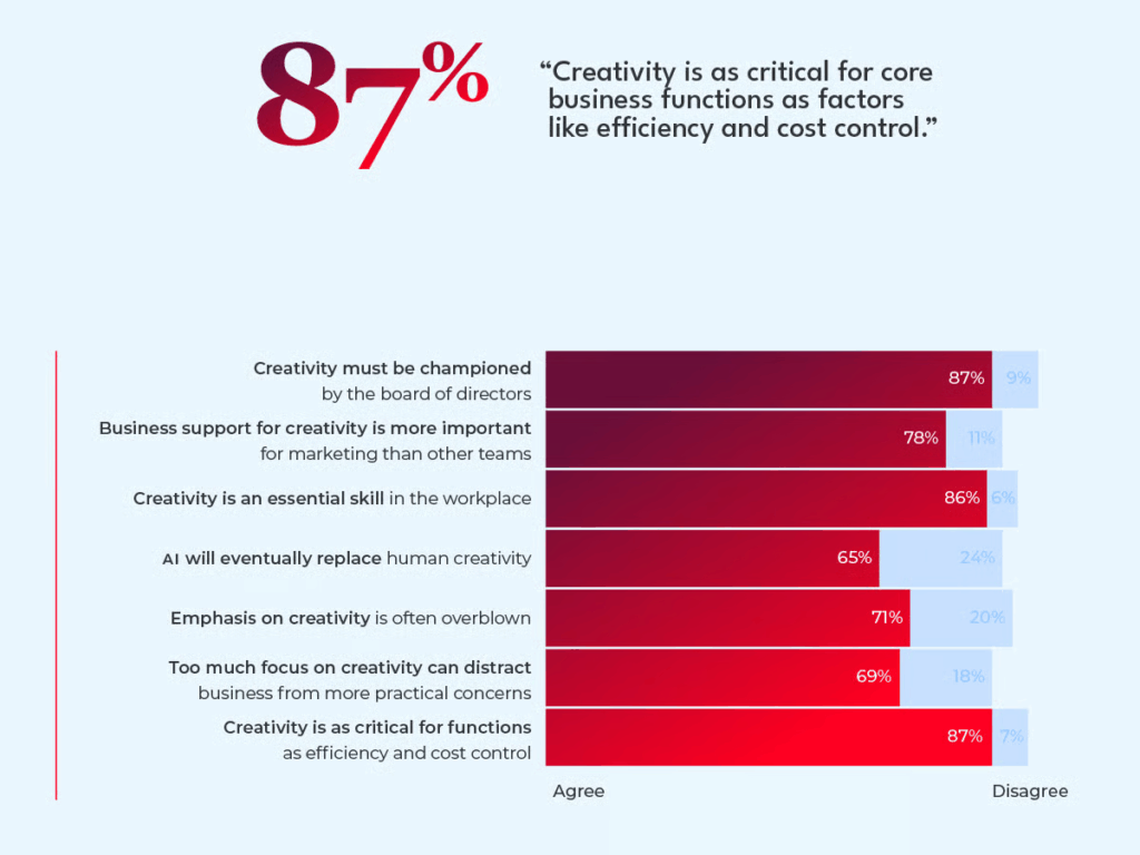 The world is in a prolonged state of uncertainty (when isn’t it?). Against this backdrop, our study reveals that rather than a vague ‘nice-to-have’, respondents view creativity as being imperative. For instance, 82% said creativity is important for driving innovation in products and services. Then 81% thought the same of spotting new opportunities in the market. When it comes to improving employee engagement and enthusiasm, 82% think creativity is important. And 82% said it was important for generating or growing revenue – reassuring that such a high proportion of business leaders agree with the over-arching hypothesis of the report. Creativity equals growth.