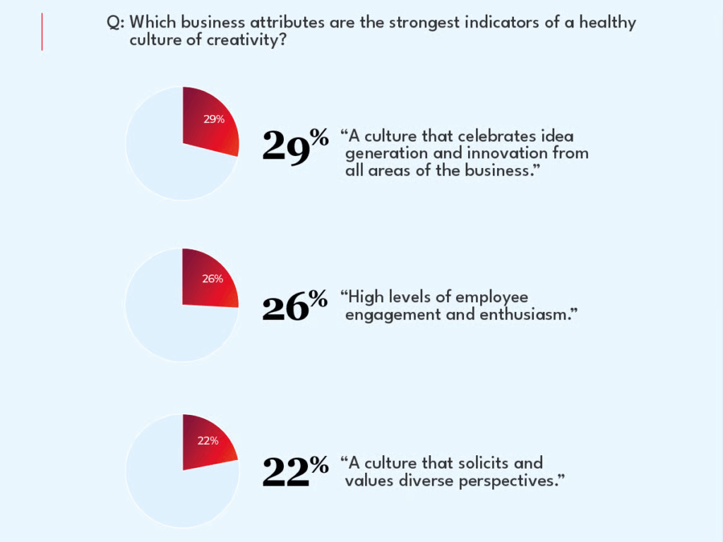 What are the signs of a truly creative organisation? Our findings expose a nuance in how we think about imagination, innovation and intuition. When asked which business attributes are the strongest indicators of a healthy culture of creativity, the most chosen answer was “a culture that celebrates idea generation and innovation from all areas of the business” at 29%. The second highest indicator of a creative culture was “high levels of employee engagement and enthusiasm” at 26%. Even as DEI initiatives are being mothballed in the face of political pressure (and an array of other factors), the answer “a culture that solicits and values diverse perspectives” scored highly, with 22% overall selecting this as the strongest indicator of a healthy culture of creativity.