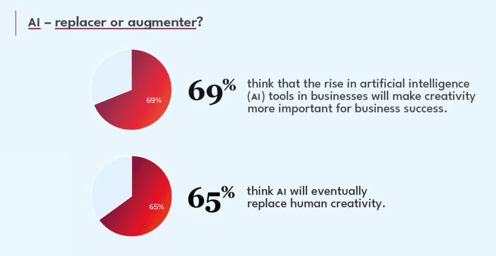 The big question surrounding creativity is to do with AI. Will it emerge as a tool for us to enhance our efforts – or simply render human effort redundant? Of our panel, 69% think that the rise in artificial intelligence (AI) tools in businesses will make creativity more important for business success (those in the US are most likely to take this view). While many believe that AI will support humans’ imaginative efforts, some foresee a future where the technology supersedes it. A small majority – 65% – expect the technology to eventually replace human creativity. Again, the US is the most pronounced in this view, with 77% of respondents int that market agreeing. In comparison, 57% of those in the UK and 61% of those in Singapore believe that AI will one day serve as a replacement for human ingenuity. It is clear that a battle of ideas is under way.